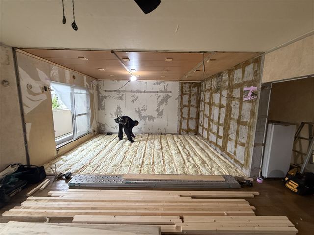 ▲旧和室 床下に防音材としてグラスウールを敷く